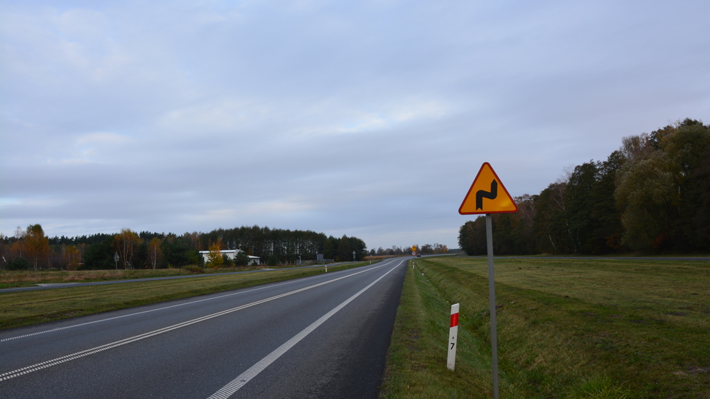 Czy widoczny znak ostrzega o dwóch niebezpiecznych zakrętach, z których pierwszy jest w prawo, a drugi może być w lewo?