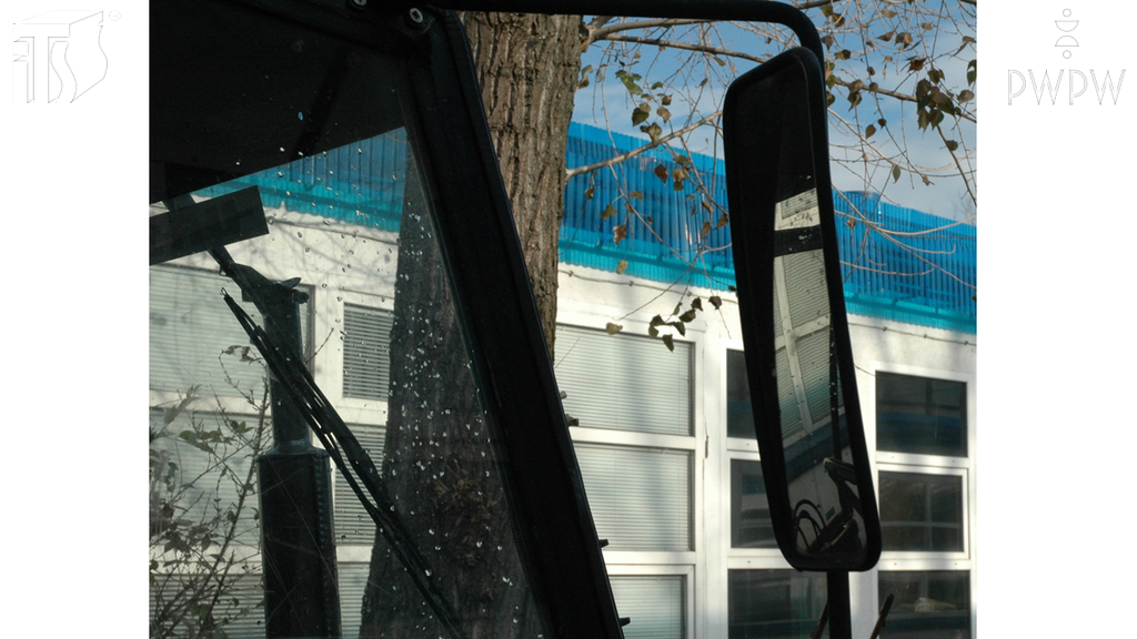 Bok ciągnika i przód przyczepy w połowie lusterka.